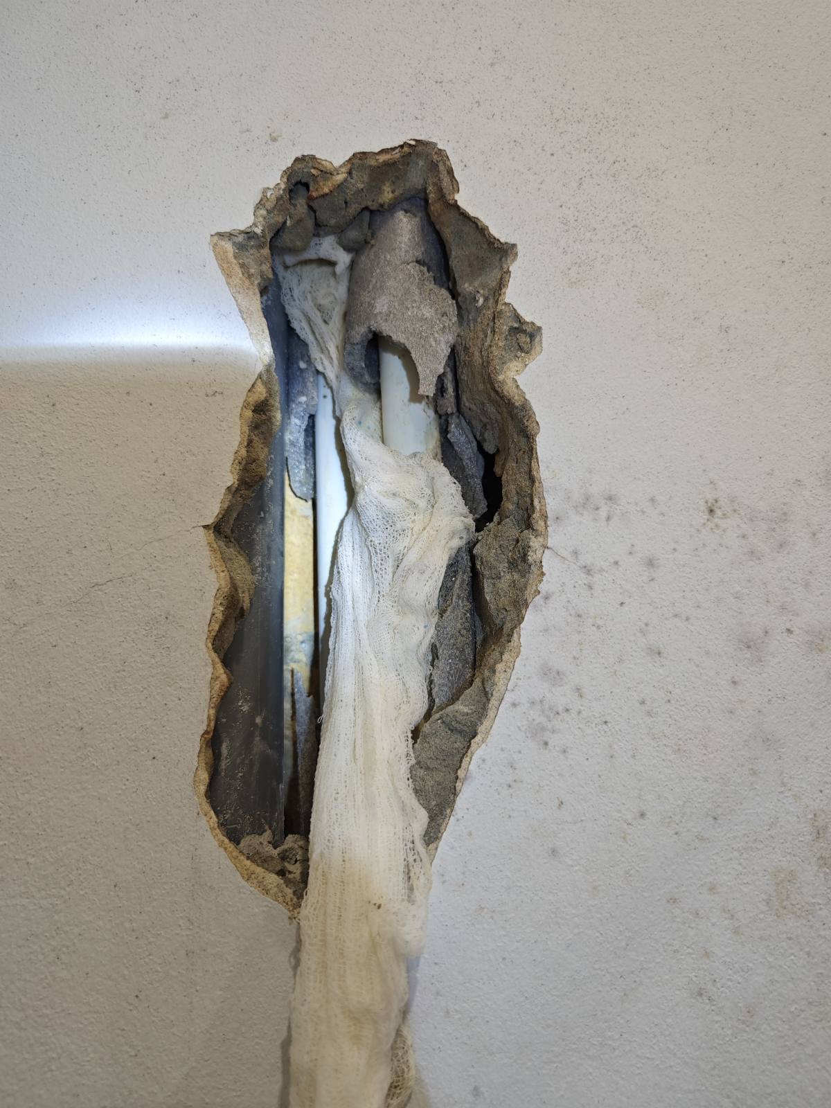 На першому поверсі в санвузлі господарі розбили стіну , в надії щось зрозуміти